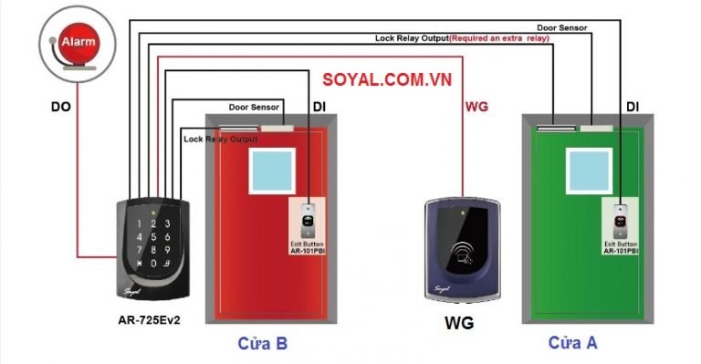 Hai cửa sẽ bố trí lắp hệ thống khóa từ Soyal, phụ kiện. Đầu đọc thẻ Soyal và đầu đọc phụ WG sẽ lần lượt lắp tại mỗi cửa. Hệ thống sẽ ngăn chặn sự truy cập bất hơp pháp khi không có thẻ, quét thẻ chưa đăng ký, mở cửa khi cửa còn lại vẫn chưa đóng,…