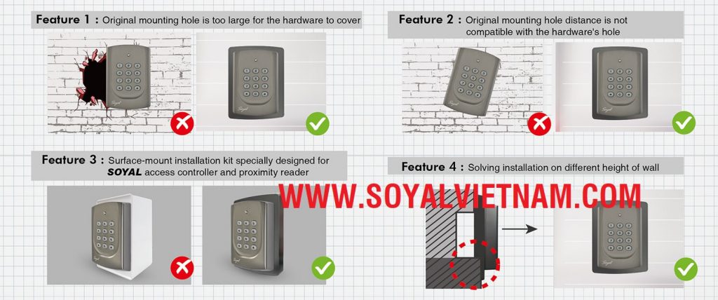 Bạn đang gặp khó khi phải lắp đặt đầu đọc Soyal cho công trình khi mà tường bị khoét lỗ to mà với kích thước của đầu đọc thẻ không thể phủ lấp được hoặc bề mặt tường gồ ghề? Nó sẽ làm mất tính thẩm mỹ cho hệ thống, vậy giải pháp của bạn như nào? Soyal sẽ giúp bạn giải quyết vấn đề này một cách nhanh chóng. Giờ đây Soyal đã cho ra mắt đế gắn tường đa năng AR-HT-98128 với thiết kế hoàn toàn mới, chất lượng cao với 2 màu xám và đen. Với đế treo tường Soyal phù hợp với mọi bề mặt tường, phù hợp với đa số đầu đọc thẻ Soyal.