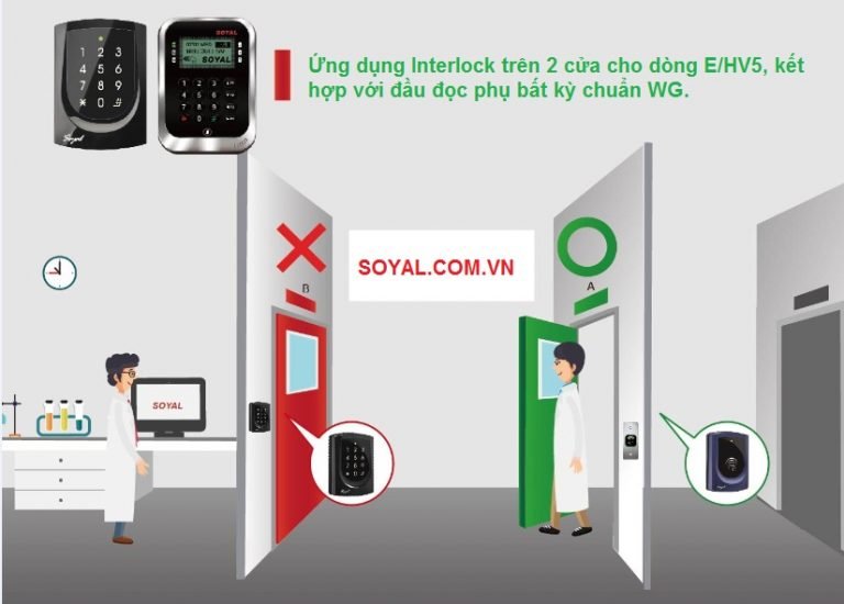 Soyal luôn đi đầu trong lĩnh vực an ninh kiểm soát, thiết bị Soyal hỗ trợ nhiều tính năng nâng cao của kiểm soát ra vào. Với mỗi tính năng có thể ứng dụng cho từng nhu cầu cụ thể được đặt ra. Interlock là một trong những tính nâng cao đã được tích hợp trong đầu đọc thẻ Soyal, đầu đọc vân tay Soyal. Interlock – vô hiệu hóa việc mở đồng thời hai cửa, nó được ứng dụng cho các nhà máy sản xuất, phòng thí nghiệm,… với các phòng chân không, vô trùng nhằm hạn chế tới mức tối đa việc không khí, bụi bẩn bên ngoài tràn vào trong phòng. Để giải quyết vấn đề đó, Soyal Việt Nam xin đưa ra giải pháp kiểm soát cửa (kết hợp mở cửa sử dụng cho hai cửa với chi phí đầu tư phù hợp) cho hệ thống này dựa vào nền tảng là tính năng interlock (khóa liên động – không cho phép 2 cửa cùng mở đồng thời, nghĩa là cửa này mở thì cửa kia phải đóng hoặc ngược lại) trên thiết Soyal.