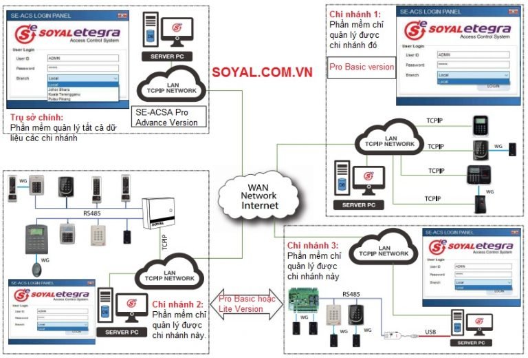 Phần mềm bản quyền sẽ cài đặt trên máy chủ tại trụ sở chính. Kết nối với tất cả các đầu đọc Soyal ở các chi nhánh. Tại đây sẽ tải toàn bộ dữ liệu người dùng về phần mềm sau đó đồng bộ xuống các thiết bị tại các chi nhánh khác nhau theo các quyền truy cập khác nhau đã được quy định trước đó. Lúc này nhân viên đảm bảo sẽ truy cập được vào các cửa đã cho phép. Các dữ liệu quét thẻ/vân tay cũng sẽ được truyền về phần mềm để quản lý, xử lý và xuất ra các báo cáo.